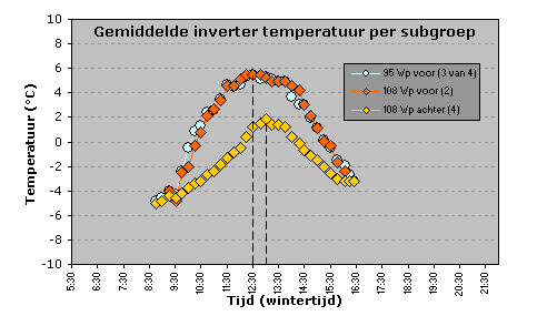 Uit de gegevens in figuur 4 en andere ervaringsgegevens kunnen de volgende gevolgtrekkingen gemaakt worden: (1) De (gemiddelde) inverter temperatuur klimt van een paar graden onder naar een paar graden boven het vriespunt op deze late najaarsdag met nachtvorst. De inverter temperatuur is afhankelijk van diverse factoren zoals de omgevingstemperatuur, de efficiëntie van de omzetting van gelijkstroom in wisselstroom door de inverter, en factoren als wind (met name bij open frames zoals in onderhavig systeem een afkoelend effect hebbend met positieve gevolgen voor het omzettingsrendement) en dakbedekking (zwart asfaltpapier heeft in de zomer een accumulerend effect op de omgevingstemperatuur met nadelige gevolgen voor het omzettingsrendement). (2) De eindtemperatuur ligt bijna altijd een paar graden hoger dan de begintemperatuur omdat, met name bij heldere nachten, de luchttemperatuur vlak voor zonsopgang het laagst is. (3) De temperaturen van de inverters op de onbeschaduwde 95 en 108 Wp zonnepanelen zijn vrijwel gelijk (alleen bij hoge omzettingsrendementen in voorjaar en zomer blijft de temperatuur van de 95 Wp inverters iets achter bij die op de 108 Wp panelen). (4) Evenals bij het momentane vermogen (Fig. 3) wordt de maximum inverter temperatuur bij de beschaduwde zonnepanelen op een iets later tijdstip bereikt dan bij de onbeschaduwde panelen (ingetekende loodlijnen).