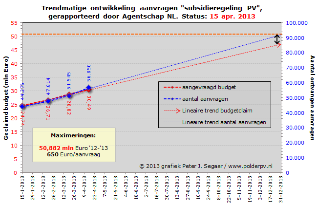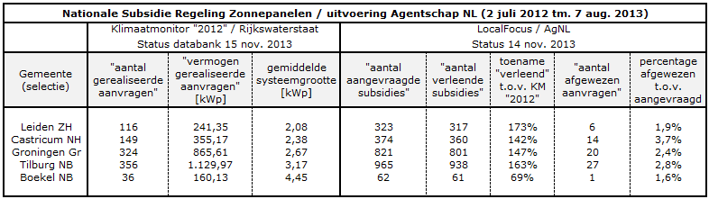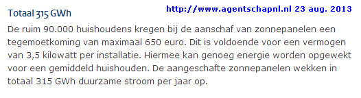 Hoe dat met een eventuele doorstart voor 2013 (budget inclusief uitvoeringskosten 30 miljoen Euro) zal uitpakken hangt af van het dan toe te kennen maximale bedrag per aanvraag/adres. Als dat fors lager zou komen te liggen, kan er veel meer capaciteit bij komen dan genoemde 116 MWp voor 2012. Gebaseerd op een max. subsidie bedrag van 500 Euro voor een 3,5 kWp installatie onder gelijk luidende voorwaarden, zou er dan zeker 206 MWp extra kunnen worden gerealiseerd. Tezamen zou dan 2012 en 2013 met alleen deze subsidies, er in theorie zo'n 322 MWp bij kunnen komen, gemiddeld 161 MWp per jaar. Is dat veel? Ja, voor Nederland is dat "veel". Maar nog steeds is het "relatief bescheiden" in vergelijking met het (wel fors qua volume afnemende) België, en al helemaal in relatie tot Duitsland. Maar significant is het beslist. Nogmaals: of de kwaliteit op orde zal zijn is de grote vraag. En de output wordt nergens centraal bemeten. De Grootste Misser Van Allemaal, als u het mij vraagt...