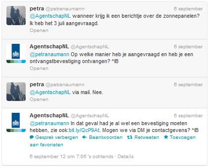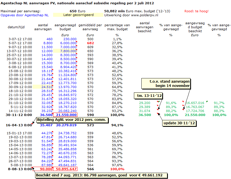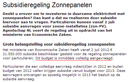 http://www.nu.nl/internet/2849371/storing-legt-site-subsidie-zonnepanelen-plat.html (2 juli 2012 - er zou volgens zeggen van Agentschap NL al voor 9 uur een technische storing zijn geweest, wat zou inhouden dat niet "een run op zonnepaneel subsidies" de schuld zou zijn. Zelfs als dat waar zou zijn, bleek het gepokt en gemazelde Agentschap NL met haar duizenden medewerkers er weer niet in te slagen een vlekkeloze start van de regeling te realiseren. Schande voor zo'n "gewilde" en blijkbaar breed gedragen subsidie regeling...