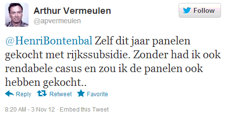 En steeds meer mensen geven volmondig toe dat ze die zonnepaneeltjes toch wel zouden hebben gekocht, ondanks de "gelegenheids-subsidie" van de Lenteakkoord partners (duurzame subsidies hekelende VVD included, de "rooie" PvdA excluded). Zelfs in de openbare ruimte geven ze het volmondig toe: