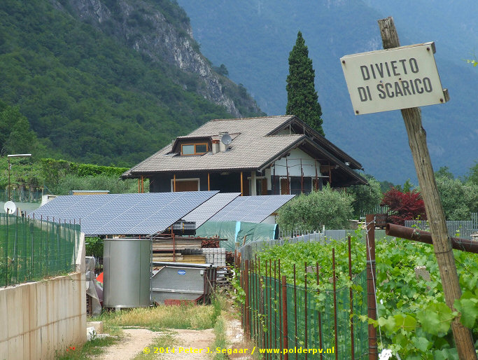 Het zal u gezien de verschillende soorten oriëntaties die we in het industriegebied van Sabbionara aantroffen wellicht niet (meer) verbazen, dat ook particulieren, laten we zeggen, ongebruikelijke, opstellingen exploiteren in het zonnige Italië. Op het pand aan de overzijde van de straat met het postkantoor van Ala zijn 10 moderne, 3-busbars per celrij hebbende multikristallijne PV-modules vertikaal op de ZZW georiënteerde gevel gemonteerd. Naast "architectonisch interessant" kennelijk ook goed voor de portemonnee van de trotse eigenaar...