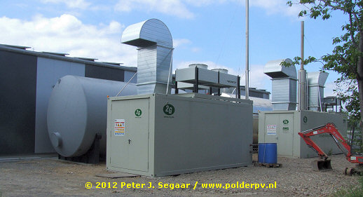 Even verderop kwamen we deze installatie tegen, op de daken van een grote biologische boerderij, Bioland-Hof Lesker KG. Deze van ruim 14.000 vierkante meter kassen en 85.000 m² agrarische grond voorziene boerderij ligt in het Ortschaft Wenningfeld westelijk van het industriegebied in het westen van Stadlohn, aan de Heideweg. Ook hier weer een opvallende combinatie van veel PV en een omvangrijke biogas installatie. Die laatste is eigendom van de buren, die een langjarig contract hebben gesloten met Lesker om warmte voor de kassen af te nemen die in grote Blockheizkraftwerk units wordt gegenereerd en de bedrijfsvoering van de kassen CO2 neutraal maakt. De enorme, 100.000 liter grote warmtebuffer is in eigendom van Lesker zelf. De rest van de benodigde warmte haalt hij uit een Hackschnitzelheizung die gevoed wordt met het houtafval van de vele heggen in de omgeving die jaarlijks moeten worden gesnoeid. Ook hiervoor heeft Lesker langjarige contracten afgesloten met de snoeibedrijven, om een zekere bedrijfsvoering mogelijk te maken, en zoveel mogelijk op "vollast" te kunnen draaien met de verwarming. Die deels wordt aangewend voor tomaten teelt, en, het nieuwste project: paprika's. Voor uitgebreide beschrijving van het innovatieve bedrijf, zie verder hier (Oekolandbau.de, 24 oktober 2011).