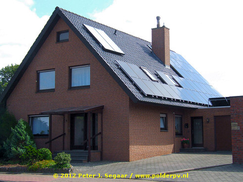 "Klassiek" en vertrouwd beeld in Duitsland. Dakvullende systemen zijn daar doodnormaal, ook bij particulieren (die net als bedrijven zeker weten over welke periode ze hun installatie zullen terugverdienen, bij constant blijvende invoedings-vergoeding, twintig jaar lang, en voorspelbare kWh opbrengsten). Zoals dit uit de kluiten gewassen exemplaar in Stadlohn, 52 monokristallijne zonnepanelen, waarschijnlijk ruim 10 kilowattpiek op een burgerlijk dakje ... en mogelijk het bijgebouw links ook nog hierbij horend. Wel een irritant klein pijpje midden in het module veld wat voor wat productie probleempjes kan zorgen (beïnvloeding string resultaat bij schaduw op het naastgelegen zonnepaneel). Mogelijk een vergelijkbaar probleempje bij een pijpje hoger op het dak.