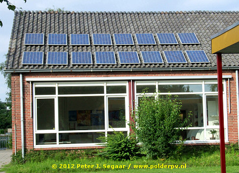 Installatie van 16 merkwaardig "los", en ook zeer dicht op de pannen gemonteerde multikristallijne PV-modules, blijkbaar zonder rail systeem direct op dakhaken bevestigd (kleine luchtspleet!). Pannendak van openbare basisschool de Kolibrie in het oostelijke deel van Winterswijk.