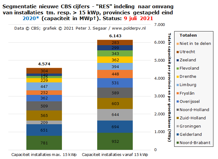 Bovenop de kolommen is zoals gebruikelijk ook nog een klein segment gestapeld met project volume waarvoor nog geen toewijzing aan een bepaalde provincie kon worden gedaan door het CBS. Dit was echter nihil voor de rooftops, voor de grotere veld installaties was dat volume - zeer beperkt - 524 resp. 1.164 kWp in de jaren 2019 resp. 2020.