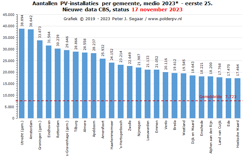 In de grafiek zijn achtereenvolgens weergegeven, voor de jaren 2012 tm. 2022, en helemaal rechts voor de status halverwege 2023: (1) Totaal aantal woningen, blauwe curve, evoluerend van 7,45 miljoen exemplaren in 2012, via 8,13 miljoen eind 2022, tot 8,16 miljoen stuks, medio 2023 (referentie rechter Y-as, opgaves x 1.000). (2) Totaal aantal woningen met PV-installatie(s), oranje curve, wat zich ontwikkelde van 71,2 duizend, eind 2012, via 1,61 miljoen eind 2022, tot alweer 2,45 miljoen stuks, medio 2023 (referentie tevens rechter Y-as). (3) Uit vorige 2 parameters berekende penetratiegraad woningen met PV-installaties t.o.v. het totale woningbestand, in procent, groene curve (referentie linker Y-as). Dit ontwikkelde zich van 1,0% in 2012, via 20,0% in 2021, en 26,2% in 2022, tot een al hoog percentage van 30,0%, medio 2023. Dit reeds hoge percentage woningen met PV-installaties is voor een ieder te zien, die door de straten van een willekeurige gemeente loopt in Nederland. Het is verbazingwekkend wat er allemaal al aan zonnepanelen op de daken ligt. Vroeger zou ik dit "Duitse taferelen" hebben genoemd. Nederland heeft dit fenomeen inmiddels ook tot "normaal straatbeeld" verklaard. *