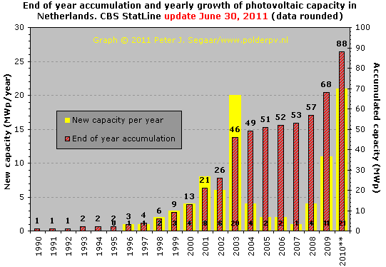 Bijplaatsing van jaarlijkse PV-capaciteit (gele kolommen, linker Y-as), volgend uit fragenswürdige, verre van volledige "enquêtes" door het CBS bij handelaren in zonnepanelen. Een shaky basis voor degelijk "marktonderzoek". In 2009 zijn slechts 59 bedrijven bevraagd, in 2010 nog steeds maar 64, er wordt heel wat "bijgeschat" waarbij geclaimd wordt dat dit maar "enkele procenten" zou zijn van het bijgeplaatste vermogen in 2010. 2003 was 6 jaar lang het "record jaar" voor zonnestroom in Nederland, door een belachelijke stapeling mogelijkheid van aanschaf subsidies die al zeer snel door destijds staatssecretaris van Geel (jawel, CDA) koud werd gemaakt wegens chronische budget overschrijdingen door de stormloop (veroorzaakt door het Nederlandse kabinet zelf). Daarna is het hele kaartenhuis weer in elkaar gesodemieterd, en kon ook de in 2008 gestarte SDE regeling (2009 volgens jaarverslag CBS slechts 10,7 MWp totaal bijgeplaatst waarvan slechts zo'n 6 MWp netgekoppeld uit SDE afkomstig kan zijn) daar aanvankelijk weinig aan veranderen. Pas in 2010 werd met de hakken over de sloot dat "historische" volume van 2003 net iets overboden, met 20,7 MWp (waarvan trouwens maar liefst 47% buiten de SDE om gerealiseerd zou zijn gebaseerd op het jaar rapport van CertiQ). Conclusie: de groei blijft marginaal, zeker in verhouding tot omliggende landen. "We moeten met elk megawattje blij zijn".
