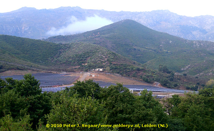 Na de introductie van een "op Duitse leest geschoeid", doch beslist eigenzinnig, sterk op BIPV toepassingen gericht, en inmiddels alweer versoberd invoedings-systeem voor de productie van decentraal opgewekte elektriciteit middels zonnestroom panelen in Frankrijk en de "overzeese gebiedsdelen", zijn er weliswaar behoorlijk wat nieuwe installaties bijgebouwd, maar het tempo is in de zonnige, van nucleaire reuzencentrales vergeven Republique Française vooralsnog tegengevallen. Het uitbouw tempo bedroeg in 2009 slechts ruim de helft van wat er in het kleine België werd bijgeplaatst (volgens Eur'ObservER cijfers 185 MWp voor Frankrijk en 292 MWp voor België). Dat laat onverlet dat de invoedings-condities zonder meer gunstig zijn, met name in de overzeese gebiedsdelen inclusief Corsica (feitelijk een regio bestaande uit twee "verdeel en heers" departementen). Daarvoor zijn hogere feed-in tarieven vastgesteld dan op het vasteland, en bovendien ligt de zoninstraling nog hoger dan in zuid Frankrijk zelf. Voor de slimste ondernemers en ondernemende types die goed bij de pinken waren was dan ook het teken: flink investeren, en het dak vol leggen. In het hierboven afgebeelde geval de "menuiserie" (schrijnwerker) Serge Bandini in Guardiola iets oostelijk van l'Île-Rousse aan de Corsicaanse noordkust. Op de foto's telde ik 20x9 = 180 monokristallijne modules in een "opdak" constructie (frame boven een golfplaat dak). Conservatief uitgaand van een 175 Wp module zou op dit ene gebouwtje dus al 31,5 kWp kunnen liggen.