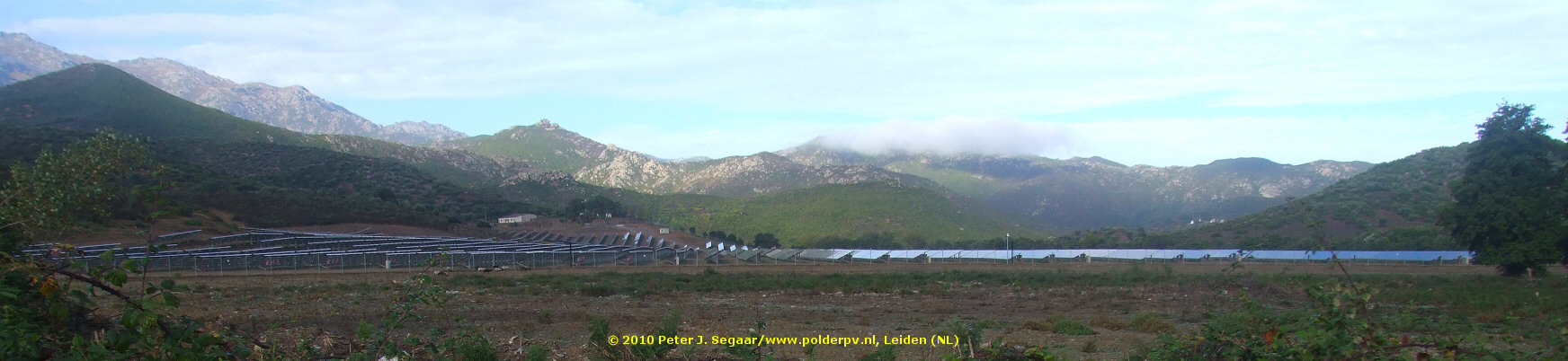 We belandden uiteindelijk op de leuke camping la Pinède aan de Aliso beek zuidelijk van St-Florent. De volgende ochtend ben ik met de Biohummer® vanaf deze camping de rimboe in gefietst om zo dicht mogelijk bij deze zeer goed "verstopte" reuzen PV centrale te kunnen komen en om leuke foto's te kunnen maken. Dat lukte, na wat zoeken naar de beste zichtlokatie(s), zeer goed. Sterker nog, nadat we de hele kampeerboel weer hadden ingepakt en we het restant van de Nebbio vallei met wederom vol bepakte fietsen "afrondden", op weg naar Bastia, kregen we bij prachtig weer onverwacht nog een lekker toetje op een presenteerblaadje. Bij dezen wordt het hoofdgerecht Rapale door Polder PV aan u geserveerd.