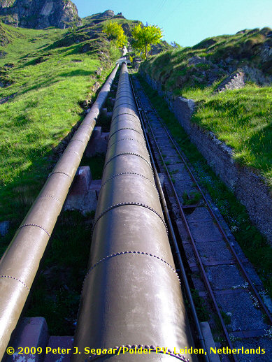 | <<< Grootschalige ingrepen in het - hier rotsachtige (dus peperdure) - landschap zijn onontkoombaar bij toepassing van waterkracht uit stuwmeren. Hier het uit grote hoeveelheden energievretend beton en staal bestaande "fraais" aan de voet van de Lago Nero dam in het Pradella massief, 2.008 m. NB: een kabelgoot was door de enorme sneeuwlast van het voorjaar over grote lengte van de supports afgebroken en drukte met de scherpe zijkant tegen dikke stroomkabels. | |