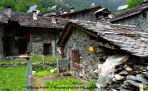 | <<< Typische kleine boerderij met autonome stroomvoorziening. Details voorzijde resp. achterzijde van het uit 2 typen multikristallijne modules bestaande PV-systeem (let op de oudere, smalle doorzichtige modules!). Baita Foppabona, 1.964 m., ten zuiden van de Grassi hut hoog boven het Valtorta (zie hierboven). |