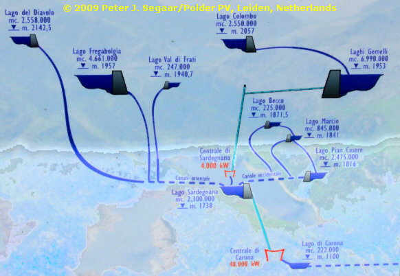 ^^^ Veel van de aldus opgewekte "piekstroom" wordt geëxporteerd naar buurlanden met hoge (dure, vaak industriële) piekvraag. De daarvoor benodigde hoogspannings-infrastructuur wordt vaak door de burgers van de betrokken landen opgehoest (lees: externaliseren van hoge systeemkosten). Het profijt is uiteraard voor de exploitatiemaatschappij van de merencomplexen en de daar aan gekoppelde infrastructuur. Gelukkig wordt grootschalige waterkracht buiten de Europese doelstellingen gehouden, anders is het wel erg makkelijk "duurzaam scoren" voor kapitaalkrachtige energie maatschappijen. Overigens is de uitbouwpotentie voor deze schaal hydropower nog slechts gering: de meeste geschikte lokaties zijn zeker in de Alpen al lang benut (ook elders op de wereld), en structurele groei in capaciteit/kWh productie is vaak fysiek onmogelijk of gering. Oude stuwmeren in berggebieden, indien niet onderhouden, zullen alleen al vanwege de fysieke omgeving waarin ze worden gebouwd, langzaam maar zeker dichtslibben en hun economische waarde verliezen. Alleen dure reconstructies en aanpassingen kunnen deze lokaties voor de langere termijn behouden. Lokatie: toevoer rond de 1.750 m. vanaf de zuidflank van het Pizzo Redorta (3.038 m.) massief naar de ENEL centrale in het gehucht Dossi (846 m.) in het Valle Seriana (westelijk van Valbondione hoog in het dal). Dik 900 meter zeer steil verval, dat staat garant voor een hoge energie opwek potentie. ENEL heeft diverse opwekcentrales in dit water/stuwmeer rijke gebied. Noord-oostelijke Bergamasker Alpen. |