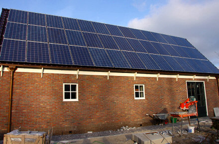 ^^^ Nog twee panelen en binnen nog even wat aansluiten alvorens er ook van dit fraai gerenoveerde bijgebouw "Nederlandse zonnestroom kan worden gebakken van Italiaanse modules". Voor het eindresultaat van dit "deelproject" aan de buitenzijde: zie foto bovenaan deze pagina. NB: alleen dit gebouwtje bevat al bijna 7 maal zoveel capaciteit dan de installatie van Polder PV... |