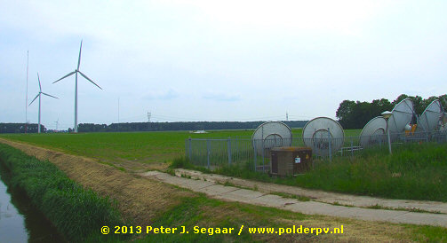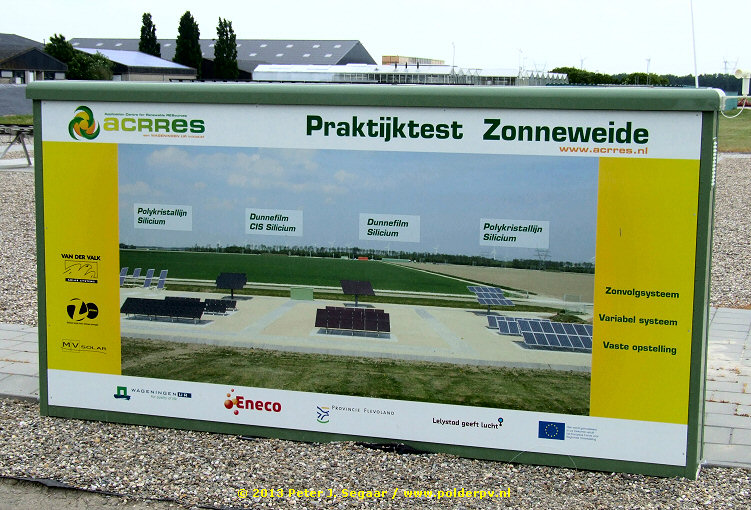 Ook hier is weer goed te zien dat zonne-stroom en elektriciteit uit wind dicht bij elkaar worden geoogst in de Flevopolder. Op de voorgrond een dubbel-assige Deger tracker met polykristallijne modules van de Koreaanse producent Solarpark (3,22 kWp). Erachter een met de hand verstelbaar frame met dezelfde modules (hier in de zomerstand, panelen onder hoek van 10 graden t.o.v. horizon), en helemaal achteraan een vaste frame opstelling met wederom de Solarpark modules (NB: in winter helaas schaduwen op achterliggende met de hand verstelbare opstelling werpend, wat diens "winteropbrengst" nadelig beïnvloedt). Op de achtergrond enkele Enercon windturbines in de lijnopstelling van het Mammoettocht project (23 MW), en een van de grote hoogspanningsleidingen die al die stroomproductie afvoeren naar grote gebruikers in de wijde omgeving. Er lopen in dit gebied diverse 150 kV trajecten (Lelystad - Zuiderveld, Kubbetocht en Dronten), en een zwaar 380 kV tracé (Lelystad - Diemen).