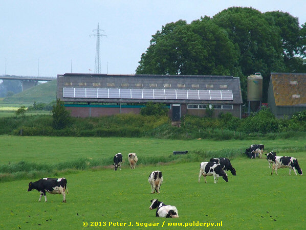 Hollandser kan het bijna niet, dit tafereeltje, ook al zullen de Overijsselaars dat wellicht anders benoemd willen hebben. Maakt niet uit, die koeien steken leuk af tegen het uit 60 modules bestaande PV-systeem op het ongeveer westwaarts gerichte dak van deze boerderijschuur in de tussen het Vossemeer en het industriegebied van Kampen liggende polder. Links op de achtergrond de begin 2003 ingebruik genomen Eilandbrug over de IJssel waar de westwaarts verlegde N50 overheen voert (verbinding Kampen met Emmeloord).