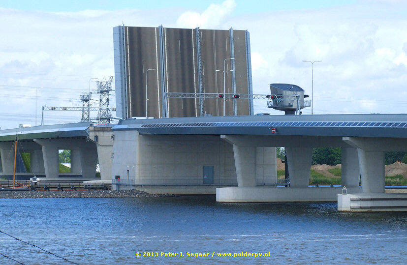 Foto vanaf de zuidelijke pier van de westelijk van de nieuwe brug gelegen balgstuw, oostwaarts over de Ramsgeul blikkend. Onder de nieuwe brug de oostelijk ervan gelegen oude, die in stukken wordt gezaagd en per boot afgevoerd. De monokristallijne Panda modules zijn afzonderlijk in een soort metalen cassettes opgenomen (met ventilatie spleten), onder een hoek van grofweg 45 graden. Door deze inpassing ontstaat een min of meer "glad" uiterlijk aan de bovenzijde van de twee vleugels aan weerszijden van de borstwering van de brug. Van een afstand bekeken ziet het er gelikt uit, de zijvleugels van de borstwering krijgen door de niet aaneengesloten modules een interessant ruitjes-patroon, alsof er vensters in zitten. Voor een goede impressie, zie de andere foto's van verschillende standpunten genomen van dit fraaie Nederlandse "PV-object".