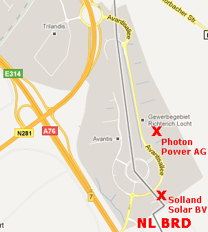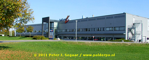 Beide moderne Europese landen hebben meebetaald aan de realisatie van die zonnecellen fabriek (aan Duitse zijde was het de deelstaat Nordrhein-Westfalen, in Nederland heeft het Limburgse LIOF cq. de oude broodverstrekker EZ - jawel - een financiële injectie gedaan, met participatie van gemeente Kerkrade). Solland ligt aan de zuidrand van het vooralsnog nog steeds erg lege Avantis terrein (plannen genoeg, realisatie lijkt vooralsnog moeizaam te gaan). De webmaster van Polder PV heeft helaas nog nooit de gelegenheid gehad om de fabriek te bezoeken. Bij de meeste productielokaties in de extreem competitieve zonnestroom sector zijn ze niet zo erg gesteld op pottenkijkers.
