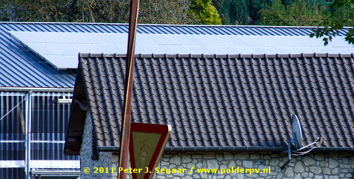 Goed verscholen, maar wel goed zichtbaar als je weet waar je moet kijken een stuk van een forse PV-installatie zo'n beetje op de eerste schuur die je op Waals grondgebied tegenkomt zodra je de grens bent gepasseerd, klimmend over de Gemmenicherweg vanuit Wolfhaag, en over de pas (= grens NL/België) richting Gemmenich afdalend. Aan de oostzijde van de weg zie je dan dit tafereel op een metalen felsendak. Drie lange rijen PV-modules, minimaal 60 modules bevattend (moeilijk te tellen vanwege bomen op de voorgrond), dus waarschijnlijk minstens 11 kilowattpiek. Tja, ook Wallonië heeft, wat ze in goed Duits een Einspeise Vergütung noemen. Al gaat het daar weer anders in de vorm van uit te keren groencertificaten voor de geregistreerde zonnestroom opwek, waarvan de waarde eens in de tijd wordt bijgesteld. Het is ook daar een continu zorgenkindje vanwege de immer dreigende politiek gemotiveerde "ingrepen". En waar een Einspeise Vergütung dan wel Certificat d'Origine Garantie is, krijg je dit soort naar meer smakende taferelen ... jenseits der Grüne Grenze / de l'autre coté de la frontière verte ...