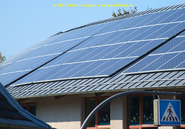 Prachtige installatie op gebogen metalen felsendak van de Gemeinschafts-grundschule Richterich in het gelijknamige dorp noordelijk van de A4/E314 ten noordwesten van Aachen. 4 blokken van 24 geeft 96 monokristallijne modules, vermoedelijk een installatie van minimaal 18 kWp. In Duitsland stikt het van dat soort installaties (duizenden), waarvan vele op schooldaken. Veel van die PV-projecten zijn ook nog eens vele malen groter. Vaak ook nog in de vorm van een Bürgerbeteiligungs-project, waarbij een groot deel van de financiering door ouders en/of door buurtbewoners wordt opgebracht. Vaak is met hun inzet makkelijk een extra lening te krijgen om complete schoolcomplex daken helemaal te laten bekleden met zonnepanelen, wat door de gegarandeerde Einspeise Vergütungen mogelijk wordt gemaakt, die verzekerde financiële opbrengsten geven, als een betrouwbare opbrengst prognose voor het betreffende systeem is gemaakt. In Nederland een blijvend riskant financieel avontuur, zeker met de met vele valkuilen omgeven en onbetrouwbare "salderings-regeling", die extreem politiek gevoelig ligt, en nauwelijks wettelijk vastgelegde zekerheden biedt.