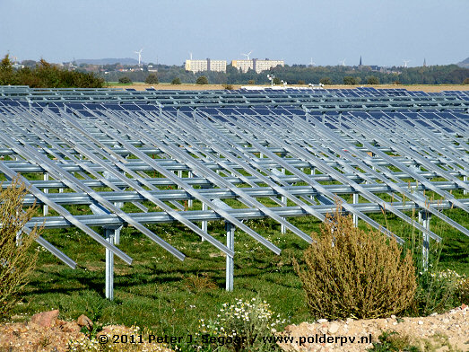 ... en die belofte werd natuurlijk ook ingelost, op Duits grondgebied. Hier een shot vanaf de meest zuidwestelijke punt van het bijna rechthoekige terrein van de PHOTON holding, richting noord-oost gefotografeerd. Op de voorgrond de reeds klaargestoomde frame opstellingen (leverancier de bekende Duitse producent Habdank) waarop een hele zooi nieuwe (Jinko Solar) modules komen te liggen. Dit is een onderdeel van het derde PHOTON Power AG project, een zogenaamde "Freiflächenanlage". Een eerste sectie van 282,5 kWp (bijna 1.450 modules van 195 Wp) zou volgens PHOTON al op 16 september 2011 aan het net zijn gekoppeld (en dus voor EEG Einspeise Vergütungen in aanmerking gaan komen). Nog eens 465 kWp zou in de tweede week van oktober al aan het net moeten gaan, en die komt waarschijnlijk op de frames in de voorgrond op de hierboven getoonde foto te liggen.