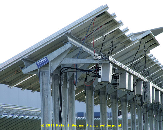 De tracker bestaat uit 15 stuks van de beroemde SunWeb® back-contact multikristallijne modules waar Polder PV al veel over heeft geschreven (hij is zelfs in het bezit van een prachtig demo exemplaar van een SunWeb® cel...). Ik was ook benieuwd naar het vermogen van de op de tracker bevestigde modules. Een blik op de achterzijde leerde me dat er hier gebruik is gemaakt van "voorlopers" van de commercieel uit te baten modules, namelijk 230 Wattpiek exemplaren. Afgaande op het inmiddels gepubliceerde datasheet, waarbij de afmetingen van de commercieel geproduceerde SunWeb® modules staan (1,613 x 0,984 = 1,59 m²), zouden deze percursors dus nog maar een rendement hebben van 14,5%. Maar het gaat hier natuurlijk om metingen op lokatie, en te kijken hoe de modules presteren bij wisselende omgevingscondities.