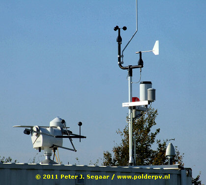 De meteorologische meetpost. Links een professionele instralingsmeter, op een volautomatische Solys 2 Sun tracker van het zeer Nederlandse bedrijf Kipp & Zonen (die prima spul levert, je ziet hun stralings-sensoren regelmatig bij grote PV-parken). Rechts een anemometer (windrichting en snelheid) en waarschijnlijk een digitale thermometer.