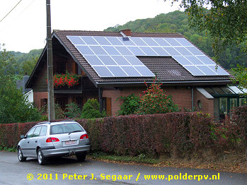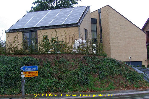 Een tweede fors uit de kluiten gewassen woning, op de belangrijkste kruising van 's-Gravenvoeren (weg naar links voert naar de gemeente Warsage [Vlaams: Weerst] in de Franstalige provincie Liège/Luik). Het zuidelijk van oost gerichte daksegment draagt 30 multikristallijne modules (waarschijnlijk minimaal 5,5 kWp) op dakhaken en een rail systeem. Zo'n mooie installatie zou op de in Nederland massaal uit de grond geramde VINEX bouwlokaties waarschijnlijk niet eens passen op een van die duizenden uniforme, grauwe kleine rijtjeswoningen ...