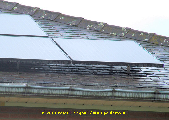 Zijaanzicht van deel van het systeem te Elzet. Opvallend is de ligging van het ene paneel, op het "verbindingsstuk" met iets lager dak.