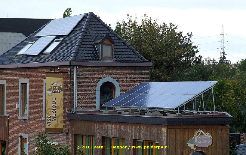 Detail van het Devant-le-Pont systeem bij de brug over de Maas westelijk van Visé. Rechts een platdak-installatie "art-Belgique", met zo te zien een zelf gemaakte opbouw constructie op betonblokken met hoekijzers, 14 modules (waarschijnlijk multikristallijn). En links, op een ietwat bobbelig, maar zo te zien gerestaureerd pannendak, nog eens 10 zonnepanelen, ditmaal van duidelijk monokristallijne oorsprong. Bij elkaar waarschijnlijk minstens 4 en een halve kilowattpiek nominaal vermogen, op veel dagen ongetwijfeld genoeg zonnestroom producerend om tijdens openingstijden van de muziekwinkel de CD spelers, en mogelijk het koffie apparaat van duurzame prik te voorzien. Musique Classique par Puissance Photovoltaique. Mozart á la Rhythme Solaire. Paco Peña Flamenco sur Électricité Vert. Het zou zo op de reclamefolder mogen, wat Polder PV betreft...