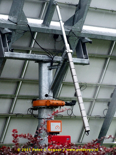 Bovenste deel van de tracker voorzijde, met duidelijk zichtbaar de afzonderlijke multikristallijne modules, en een obligate wind sensor. Of de hard- en software achter die sensor ook de eigenaar op de hoogte stelt van een gearriveerd stormfront als deze toevallig net een week op vakantie is, is mij niet bekend. Een oppervlakte van ruwweg zo'n 35 vierkante meter wil nogal wat wind vangen namelijk, zelfs met luchtspleet tussen de module rijen in...