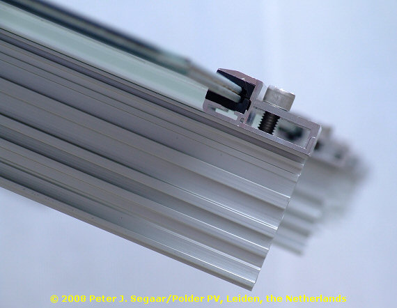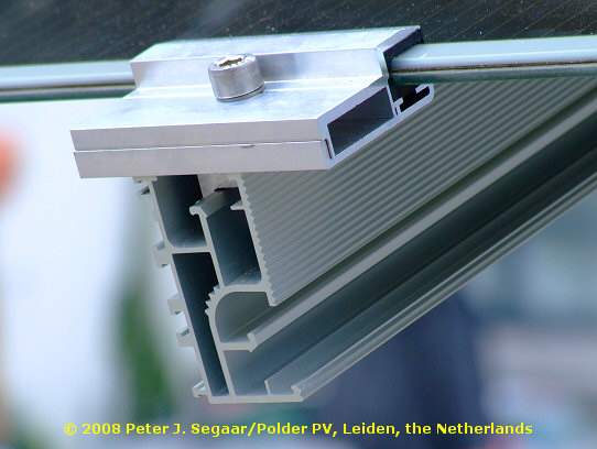<<< The essence is in the details. Also concerning thin-film technology. One of its specific problems is a reliable fixation of the often thin double-glass laminates onto a bearing frame. Huge problems have occurred by using oversized, non-fitting clamps (leading to breakage). Hence, special clamps have been developed. For detail from the side, click here. Photo from SolarLinea II mounting system for thin-film modules by solar park developer Conergy AG from Hamburg, Germany (via their Epuron offspring).