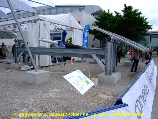 While in Freiburg (2007) one of the central themes appeared to be the omnipresence of a staggering array of solar "trackers" (mostly for Si-based PV-modules, and for the biggest part meant to be installed in feed-in attactive, sunny Spain), a considerable number of companies on Intersolar's first presentation in Munich were displaying an array of very interesting "solar concentrators". Not to be mistaken for the also rapidly developing concentrating solar power (CSP) technology, which applies heated fluids and steam for generating electricity in desert-like areas (these are almost always developed at a huge scale to suppress cost price of the output).