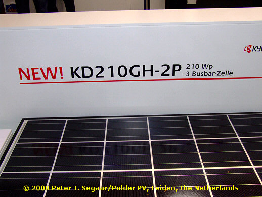 <<< Well-known Japanese Kyocera is upgrading the nominal power for most of their modules. This new multicrystalline specimen, KD210GH-2P, with black cells with 3 distinct "bus bars" already has a rated power of 210 Wp. Nice modules, reliable and long-time producer. Kyocera still has the world record for multicrystalline cell efficiency, 18.5%. An example can be seen HERE.