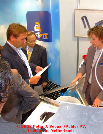 Although the Dutch PV market remains small because of ongoing political shortsightedness and tear-jerking sabotage by bureaucrats, several companies make good products and sell them abroad in solar energy loving countries. Here the busy stand of ClickFit demonstrating their light fixing rail system that has been TÜV certified, although (fewer and fewer) people still do not believe what their eyes tell them. There is also a new, interesting flat roof frame: click here. Thanx for the hospitality, Vincent and Theo! >>>