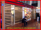 <<< Stand of Applied Materials with a monster amorphous thin film module (9% efficiency) made by Signet Solar (using AM equipment) measuring 2.2 x 2.6 = 5.72 m² in surface. One quarter or half this size can also be made. AM claims that 7.5 times less modules are needed for 1 MWp of installed power in free field installations as with conventional thin film modules (think of the popular CdTe types of FirstSolar). These type of installations could become cheaper because of the principle "less labor per Watt", as the company claims. AM has also developed specific "plug and play" junction boxes with an unnamed third party for these kind of modules. Click here for photo.