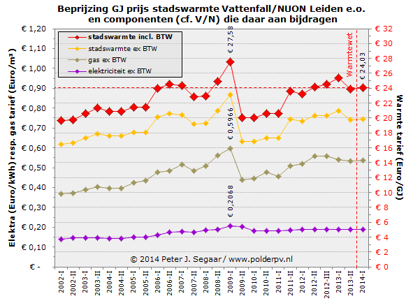 escape afscheid kookgas Leiden e.o. Voor een inleidend artikel tot deze grafische pagina voor het jaar 2014, zie bericht van 27 januari 2014 (voor intro tot tariefstellingen 2013, zie bericht van 4 februari 2013). Daarin ook tabellen met tarieven en stijgings-percentages. Introductie De hier gepresenteerde nieuwste tariefstellingen voor 2014 zullen waarschijnlijk gelden tot en met juni. Vrijwel niets van de vele tegenwerpingen van vertegenwoordigers van diverse stadswarmte wijken is bij de totstandkoming van de "tariefcomponenten" gehonoreerd. De warmteklanten blijven nog steeds speelbal van monopoloïde, door de NL Staat in het zadel gehouden energie conglomeraten, en ze dokken een absurd tot stand komend, compleet fictief bepaald, torenhoog vastrecht. En ze moeten hemel en aarde bewegen om van dat juk af te komen. Als dat juridisch niet onmogelijk is gemaakt. Voor gedwongen stadswarmte klanten is een "vrije" energie markt een illusie, zeker als ze zuinig stoken. Ze zijn, in essentie "energieslaven". Of, wellicht beter: "vastrechtslaven". En de prijs voor de warmte zelf wordt altijd naar de (i.t.t. elektra) relatief hoge gasprijs toegerekend. Lucratief voor de leveranciers. Een bittere pil voor de gedwongen klanten. De tarieven die op deze pagina worden gehanteerd zijn die zoals die gelden voor "Leiden e.o.", voor alle gebonden klanten die afhankelijk zijn van het stadswarmtenet van Vattenfall/NUON. Dat "net" wordt gevoed door de gasgestookte STEG centrale in de handen van een andere (Duitse) moloch: E.ON (centrale Langegracht). Ook daar alweer donkere wolken, want vanwege de enorme hoeveelheid elektriciteit uit hernieuwbare bronnen in Duitsland, en de doordraaiende gigantische bruinkoolcentrales, zijn de marktprijzen ultralaag. En is of wordt de exploitatie businesscase voor gasgestookte centrales - en dus ook degene die ingezet worden voor stadsverwarming - onhaalbaar dan wel niet meer winstgevend. Uit goed ingelichte kringen werd vernomen dat ook de E.ON centrale in Leiden "er aan zou moeten gaan geloven". Ook al is recent het contract tussen warmte"broker" Vattenfall/NUON en restwarmte producent E.ON tm. 2020 verlengd: wat daarna gaat gebeuren is volstrekt open, en de vooruitzichten zijn niet best. Ieder ander stadswarmte klant zal voor zijn/haar eigen specifieke situatie de gegevens bij elkaar moeten zien te krijgen. Bij Vattenfall staat een hele reeks tariefbladen die soms vergelijkbare componenten bevatten, maar ook vaak heel andersoortige tarieven. De situaties zijn beslist niet altijd identiek (zo is er de beruchte aparte tapwater warmtewisselaar, o.a. in Almere, waar mensen extra vastrecht aan betalen, een apparaat wat we Gaia zij dank in Leiden niet hebben). Dus 1 op 1 vergelijken is de facto onmogelijk. Uiteraard kunt u wel "richtlijnen" en "trends" uit de hier gepubliceerde, unieke grafieken halen, die vergelijkbaar kunnen zijn in veel projecten. (1) Prijsontwikkeling componenten en Gigajoule prijs