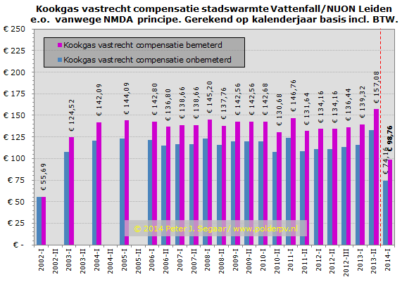In deze vergelijkbare grafiek, maar dan voor stadswarmte klanten die (verondersteld) "gemiddeld" 35 GJ/jaar zouden verbruiken, komen de verhoudingen tussen de vastrecht load (magenta) en variabele kosten (lichtgeel) er compleet anders uit te zien. Het vastrecht stadswarmte heeft op deze nota's een veel lagere impact, al neemt ook deze natuurlijk fors toe door de continue vastrecht woeker die zelfs onder het toezicht van ACM door is gegaan, en zelfs explosief is gestegen sinds de tweede jaarhelft van 2013. De vastrecht load bij dit type stadswarmte klant steeg van 21,9% in de eerste jaarhelft van 2002 tot al 34,3% in de eerste jaarhelft van 2014. In totaal stegen de totale jaarkosten (vastrecht plus verbruikskosten) van 880 Euro in 2002-I tot 1.281 Euro in 2014-I. Een verschil van 45,5% in 12 jaar tijd, 3,9% hoger dan de tariefstelling in het vorige half jaar (2013-II). En over de gehele periode gemeten een gemiddelde jaargroei van (CAGR) 3,17%. Een stuk lager dan de bijna 5% jaargroei bij zuinige verbruikers (9 GJ/jaar). Zou je nog veel meer gebruiken, kom je nog maar op (CAGR) jaargroei cijfers van 2,82% (50 GJ/jaar) tot zelfs nog maar 2,21% uit (bij 125 GJ/jaar). De harde les is duidelijk: door de tot absurde proporties uitgegroeide, ongeremde vastrechtwoeker bij stadswarmte lijden de zuinig verbruikers het meest, en wordt hun maatschappelijk toe te juichen zuinigheid impliciet bestraft "onder toezicht van de Autoriteit Consument en Markt"... Let op dat voor de periode 2009-I er wel, vanwege de toen zeer hoge GJ prijs (kunstmatig gekoppeld aan de toen absurd hoge gasprijs), voor deze gebruikscategorie (35 GJ/jaar) een "nota record" is geweest van maar liefst 1.312 Euro op jaarbasis. Echter: door de crisis stortte de gasprijs als een leeg gelopen (speculatie) ballon in, zakte ook de GJ prijs als een plumpudding in elkaar, en heeft de van niets wetende warmteklant die enorme prijspiek in de eerste helft van dat jaar nauwelijks bemerkt door de uitmiddeling van de tarieven over de hele notaperiode (meestal een periode van "ongeveer een jaar, die bijna nooit hetzelfde is als het kalenderjaar"). Het vastrecht bleef in 2009 in beide jaarhelften op hetzelfde niveau. Vandaar dat het aandeel vastrecht in de tweede jaarhelft zeer sterk toenam, van 26,4 naar 33,1%. (6) Kookgas vastrecht compensatie Vattenfall/NUON Leiden e.o. Een van de meest onwaarschijnlijke complicaties in onze wijk Stevenshof in Leiden is dat we naast een stadswarmte netwerk (gebonden klanten) óók een lagedruk kookgas netwerk hebben. Waar nog steeds de meerderheid van de woningen op is aangesloten, de meeste mensen gebruiken nog steeds kookgas (wat fysisch bezien nog steeds een van de efficiëntste vorme. Dit heeft na de liberalisering de nodige complicaties gegeven, want per 2005 is de netbeheerder Liander (toen nog Continuon geheten), én de gasleverancier (bijna uitsluitend in die tijd, gezien het zeer lage verbruik, allemaal "klant van NUON") zomaar vastrechten voor die aansluiting zijn gaan factureren. Waardoor we met een enorme verhoging van de vastrecht load werden geconfronteerd. In het NUON Soap dossier kunt u nalezen wat er zoal voor kafkaëske taferelen zich hebben afgespeeld rond dit byzondere (doch niet unieke) thema in onze wijk. Na hardnekkig aandringen zijn er destijds gesprekken geweest met NUON. Kregen we voor het eerst zeer gedetailleerd inzicht in de extreem ingewikkelde tariefpyramide rond de "stadswarmte met kookgas" beprijzing. En werd door het bedrijf uiteindelijk sinds 2005 een kookgas vastrecht compensatie uitbetaald aan alle klanten met een intacte lagedruk gas aansluiting. Die "zou moeten compenseren" voor het feit dat we én vastrecht stadswarmte betalen (waarvoor "vermeden kosten voor vastrecht gas voor ruimteverwarming" worden gebruikt, niet zichtbaar op jaarnota's of tarief overzichten). Én, sinds 2005 "zichtbaar" op onze nota's een slechts iets geringer vastrecht voor de kookgas aansluiting. Bestaande uit 4 posten netbeheer, waaronder "capaciteit" van aanvankelijk max. G4, en later max. G6 tm. 500 Nm³/jaar, plus een vijfde post "vastrecht levering" van de betreffende leverancier van kookgas. Bij nog steeds de meesten in onze wijk waarschijnlijk Vattenfall/NUON (je gaat meestal niet voor een paar kuub kookgas per jaar naar een andere "leverancier" overstappen, dat levert financieel bezien vrijwel geen drol op). Er wordt bij die voor ons essentiële compensatie post, die Vattenfall oneigenlijk zeer hardnekkig een "korting" blijft noemen, en die keihard volgt uit het "Niet Meer Dan Anders" principe, onderscheid gemaakt tussen "bemeterde" en "onbemeterde" aansluitingen. Laatstgenoemde vinden we nog wel eens in complexen met "blokverwarming". In de Leidse Stevenshof hebben alle ingezetenen echter allemaal een eigen kookgas meter, met een byzonder lage capaciteit van G1,6. Al worden we al jaren stiekem de duurdere capaciteit voor aanvankelijk G4, en inmiddels alweer G6 "toegerekend". Zo "doen" wij dat bij netbeheer... Uit gedetailleerde tariefoverzichten tm. 2007 en de sinds 2005 tot mijn beschikking staande tariefbladen van Continuon en rechtsopvolger Liander volgt de volgende "evolutie" van die mysterieuze component "kookgas vastrecht compensatie" (zoals die genoemd zou dienen te worden, omdat het de enige correcte benaming is vanuit het standpunt van de eindgebruiker). (6a) Evolutie kookgas vastrecht compensatie bemeterd / onbemeterd