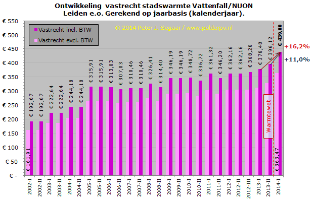 slot Voor veel meer info over de problematiek rond stadswarmte en, vooral, de extreme complicaties door de aanwezigheid van een kookgas aansluiting in de Leidse Stevenshof, zie verder het dossier "NUON Soap" op Polder PV, te beginnen bij de "actuele" pagina. Links ACM stelt tarieven voor nieuwe Warmtewet vast (20 dec. 2013 - vastrechtwoeker wordt dé business-case voor stadswarmte netten, klanten worden massaal belazerd) Nieuwe Warmtewet per 1 januari 2014 (december 2013 - slijm epistel van Vattenfall/NUON waarin beloofd wordt dat "klanten met een aansluiting op een (stads)warmtenet extra beschermd" zouden gaan worden, en "Zodat ze zeker zijn van warmtelevering, niet te veel betalen en een goede service krijgen". Wat een regelrechte leugen is gezien de schaamteloos gevolgde vastrechtwoeker). "Standaard stadswarmtetarieven per 1 januari 2014" (begin januari 2014 gepubliceerd door Vattenfall/NUON n.a.v. inwerking treden Warmtewet en ruime "tarief dictaten" ACM) Alle tarieven voor stadsverwarming (pas op 20 januari 2014 geopenbaard: tariefstellingen stadswarmte en koude projecten en warmtepomp tarieven bij Vattenfall/NUON). "En dan nu de OORLOGSVERKLARING van #Vattenfall en @ACM aan #stadswarmte gebruikers #Leiden" (hele boze tweet van Polder PV vlak nadat de SV tarieven van Vattenfall werden gepubliceerd voor 2014) Tilburgse wijk Reeshof legt claim van 100 miljoen euro neer bij Essent (24 jan. 2014, Omroep Brabant. Veel meer ellende in het land, Reeshof betaalt de HOOFDPRIJS met vastrechtwoeker hors categorie van ... 610 Euro per jaar! Een rechtszaak lijkt onvermijdelijk als er geen oplossing voor de aansluitbijdrage woeker wordt gevonden) Eerdere versie van data en grafieken gepubliceerd in 2008, later enkele data tm. 2011 toegevoegd. Voorbereidingen en pagina opmaak met data 2013 medio-eind januari 2013. Eerste uitgebreide versie gepubliceerd dd. 4 februari 2013. Een nog uitgebreider versie met de eerste gevolgen van de invoering van de Warmtewet, en de tariefstellingen voor 2014 dd. 27 januari 2014.