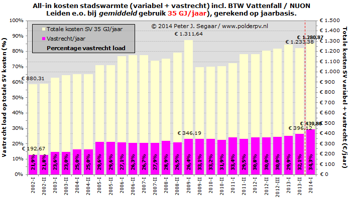 Directe stadswarmte gerelateerde kosten Vattenfall/NUON bij gemiddeld verbruik van 9 GJ/jaar (extreem zuinig). Direct is duidelijk dat de vastrecht load voor zo'n huishouden (magenta kolom segment onderaan) monumentaal is. In de kolommen staat onderaan het percentage van het vastrecht aandeel op de totale kosten vastrecht + variabel. Dat is bij het genoemde lage verbruik opgelopen van 52,1% in 2002-I naar een absurde 67,0% in de eerste jaarhelft van 2014. In lichtgeel zijn de variabele kosten gestapeld. Verder zijn de bedragen voor vastrecht en totale kosten weergegeven voor 2002-I, voor het "record" tijdvak GJ prijs in 2009-I, en voor de twee laatste jaarhelften. 2013-II, resp. het "record totaal" warmte kosten tijdvak 2014-I. Waarbij de totale "directe" kosten te betalen aan Vattenfall/NUON zijn opgelopen tot bijna 657 Euro op jaarbasis. 78% hoger dan de tariefstelling in 2002-I, en alleen al 7,5% hoger dan de kosten in de vorige halfjaar periode. Waarbij de CAGR berekening over de gehele getoonde periode een gemiddelde jaarlijkse groei van de directe stadswarmte kosten laat zien van maar liefst 4,90%. (5c) Totale kosten stadswarmte vastrecht + variabele kosten bij 35 GJ/jaar