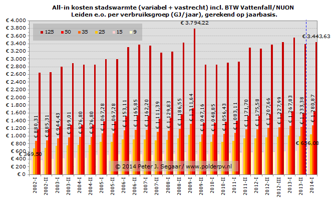 Deze grafiek lijkt op de vorige. Afgezien van de kleurstelling is het verschil dat bovenop de variabele (door gedrag beïnvloedbare) kosten het vastrecht stadswarmte is gestapeld. Alle verbruikers die hier zijn getoond betalen daarvoor (bij "standaard comfort klasse 3-4" aansluiting) hetzelfde bedrag (in oorspronkelijke opzet tm. 128 GJ/jaar). Bedragen inclusief BTW. In vetdruk het totaalbedrag wat een zogenaamde "gemiddelde" SV verbruiker (35 GJ/jaar) bij Vattenfall zou zijn kwijt geweest op jaarbasis, inclusief variabele kosten en vastrecht stadswarmte. Dat bedrag is fors toegenomen van ruim 880 Euro (tariefperiode 2002-I) tot 1.281 Euro (tariefperiode 2014-I). Voor zuinige "stokers" zoals wij (9 GJ, bruinrood) is de schade nog meegevallen, stijgend van 370 naar 656 Euro (maar dan nog...). De "zware verbruikers" zijn natuurlijk helemaal de klos met de prijzige gigajoultjes: de klanten met 50 GJ/jaar op de teller zouden de huidige tariefperiode op jaarbasis bijna 1.281 Euro kwijt zijn aan de SV nota. Maar in de duurste tariefperiode 2009-I zou dat zelfs bijna 1.312 Euro kunnen zijn geweest op jaarbasis. Een feest voor de SV-"aanbieder" (monopolisten). "Gelukkig" voor genoemde grootverbruikers, was het tarief in de tweede jaarhelft van dat jaar fors onderuit gegaan vanwege de diepe economische crisis, waarbij de gasprijzen, en dus ook de daar aan gekoppelde gigajoule stadswarmte prijzen - helaas slechts tijdelijk - onderuit gingen. (5b) Totale kosten stadswarmte vastrecht + variabele kosten bij 9 GJ/jaar