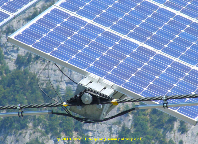 Ander zijaanzicht, met kennelijk een andere lagerhuis set-up van de kolommen (duidelijk klemconstructie op stationaire kabel zichtbaar). Let op de tint-verschillen tussen de zonnecellen in deze al wat oudere Sharp modules. Op de achtergrond de imposante rotswanden van het Churfirsten massief (Appenzeller Alpen boven de Walensee).