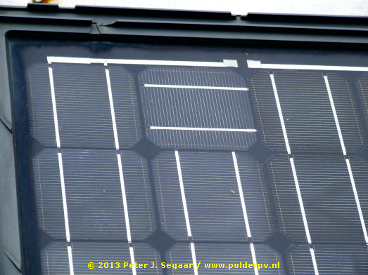 Mooi uitgelijnd black-line systeem met moderne multikristallijne PV-modules (3 busbars per celkolom, 2 foto's), "om de dakkapel heen gedrapeerd". Ongeveer 36 panelen, potentieel zo'n 9 kWp. Een voor NL begrippen "forse" residentiële installatie.