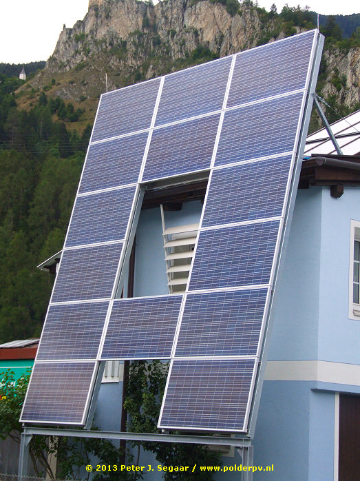 Prutz (Tirol, 2 foto's), ZO van Landeck, Oberinntal. Ook voor ronduit "uitdagende" en opmerkelijke PV-constructies in de residentiële sector draaien Oostenrijkse architecten hun hand niet om. Niet ver van het vorige exemplaar, ook weer nabij het centrum van Prutz (zuid-zijde) een zeer steil op zuid georiënteerde, forse installatie opgehangen in een zware staalconstructie op/aan een nieuw pand. Met een "gat" in het midden om zonlicht het gebouw in te laten via een raam met jalouziëen. 15 moderne multikristallijne PV-modules (plm. 3,75 kWp). Op het schuine dak rechtsboven liggen nog eens minimaal 6 thermische collector platen.