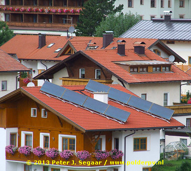 Paznauntal. In de lange afdaling vanaf de Bielerhöhe, Tirol in, kwamen we uiteraard weer veel zonne-energie installaties tegen. Dit was wel een hele byzondere, die in ons polderlandje minimaal de nodige wenkbrauwen zou doen fronsen (zeker die van de opstellers van dit hoogst dubieuze document met kromme uitvoeringsregeltjes, gekopieerd uit een of andere middeleeuwse handleiding...). Een dubbele thermische collector opstelling op een schuin dak, aufgeständert, en dan ook nog eens schuin op het dak. Je zou het "Sonnenblick auf Bergblick" kunnen noemen. Kennelijk geen probleem in deze contreien, waar het opwekken van energie uit hernieuwbare bronnen, en het in gang zetten van een echte Energiewende boven alles prioriteit heeft. En zeg nou zelf: zo'n opvallend paars-blauw gekleurde collector installatie op een rood-bruin gekleurd pannendak heeft ook wel wat. Breekt de eeuwige sleur een beetje...