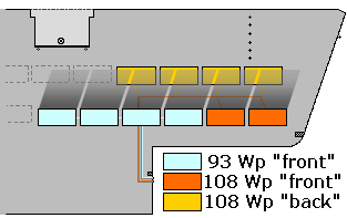 Beschrijving PV-systeem en installatieGrafische weergave van installatie op dak; kleurcoderingenHoofdgroepen Op deze pagina worden 3 schematische overzichten weergegeven van het op deze website gepresenteerde PV-systeem van 10 AC-modules. Het PV-systeem maakt deel uit van een in drie fasen gerealiseerd project "zonnepanelen op huurwoningen" in de periode 2000-2002, in samenwerking met de verhuurder Portaal (zie ook installatie schema's in de sectie historie) op initiatief van de maker van deze website. In dit project is de plaatsing van 28 zonnepanelen gerealiseerd, waarvan 22 op het hier deels afgebeelde platte dak op de 4e verdieping van de woontoren van ons complex, en 6 op het schuine dak van de buren van het gebouw. De 28 zonnepanelen zijn eigendom van 4 eigenaren (huurders); een deelsysteem van 6 zonnepanelen wat is aangesloten op de gemeenschappelijke ruimte in dit Centraal Wonen complex is, via een unieke schriftelijke overeenkomst (LINKen), formeel in eigendom van de verhuurder overgedragen, waarbij de volledige energieopbrengst van het PV-systeem aan de bewonersvereniging toekomt. N.B.: de in deze schema's gehanteerde kleurcodes voor de zonnepaneel/inverter combinaties worden ook in de EXCEL spreadsheets met productiegegevens consequent gebruikt om de resultaten van de verschillende (sub-)groepen goed naar voren te laten komen. Het werkt prettig en overzichtelijk, zeker als de spreadsheets een behoorlijke omvang gaan aannemen en er deelberekeningen voor specifieke grafische prestentaties worden gemaakt. Voor serienummers van de (meest recent) geïnstalleerde inverters en zonnepanelen, klik op de plaatjes voor een vergroting in hetzelfde venster (keer terug naar deze pagina door op de "vorige" of "terug" knop te klikken). HoofdgroepenA. In deze figuur zijn de 2 hoofdgroepen weergegeven van ons privé PV-systeem op de oostelijke helft van het platte dak; zuid is aan de onderzijde van de figuren. De lichtblauwe groep bestaat uit 4 parallel aangesloten 93 Wp (ACN2000E) panelen, totaal 372 Wp; deze is geplaatst op 6 maart 2000 en een week later (13 maart) op het huisnet aangesloten. De op een separate AC-kabel aangesloten paarse groep bestaat uit 6 parallel aangesloten 108 Wp (ACN5000E) panelen, totaal 648 Wp, en is geplaatst en aangesloten op 12 oktober 2001. Alle panelen zijn gemonteerd op open frames en onder een hoek van 30 graden t.o.v. het horizontale vlak pal zuid georiënteerd (in vaktermen: azimuth = 180 graden t.o.v. noord). Enkele van de overige 12 zonnepanelen op dit dak zijn met streepjeslijnen aangegeven naast ons systeem. Verder zijn de diverse typen ventilatoren (mechanische ventilatieunit per appartement, helaas zonder warmtewisselaars) met open en zwarte kruisjes of rondjes (vergrotingen) aangegeven. Om geen problemen met monteurs e.d. te krijgen is er voor gekozen de zonnepanelen niet te dicht bij deze units te plaatsen; dit heeft met name consequenties voor de 4 achterste panelen (kunnen niet verder naar achter). Gestippelde vakjes zijn regenwaterafvoeren; let op dat de 2 AC-kabels van de 2 hoofdgroepen aan de buitenzijde van de onderste regenwaterafvoer naar de begane grond worden geleid (in zelf geïnstalleerde mantelbuizen). Bovenin is met een lichte kleur grijs een verlaagd stuk dak met daarop een vlaggemast (rondje met kruis) weergegeven; er is geen probleem met schaduw van de mast omdat deze aan de noordzijde geplaatst is. De dakrand is maximaal 25 cm. hoog en geeft vrijwel geen, of slechts zeer korte tijd problemen i.v.m. schaduwwerking bij laagstaande (ochtend)zon (onze zonnepanelen staan relatief dicht bij de zuidoostelijke dakrand). Voor