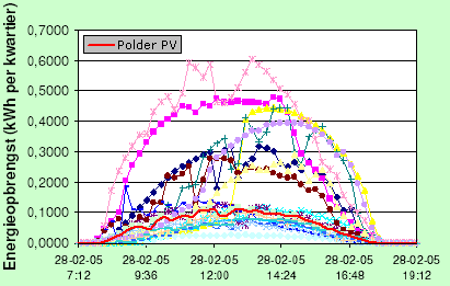 © March 2005 PVSAT Nieuwsbrief nr. 1/Organisatie voor Duurzame Energie (with kind permission from Corry de Keizer); overlay of Meteocontrol logging data for enhancement data Polder PV (red) by Peter Segaar/Polder PV.