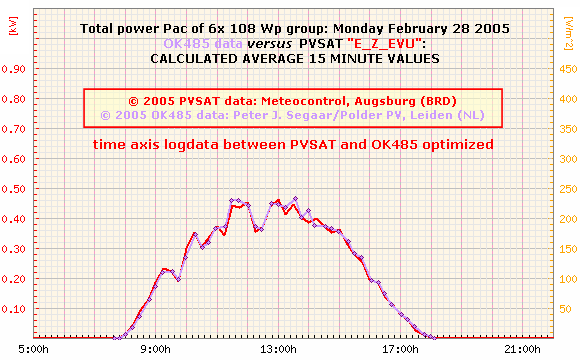 On this page some important results are given for the PVSAT-2 project, in part in close harmony with my own measurements with the OK485 data interface (direct readings from the OK4E inverters), for sunny February 28 2005 (see for other system parameters the day graphs given on web page dagcurves_28feb05.htm). This page is further presented to you in the English language to facilitate the understanding for foreign PVSAT users and other interested people.