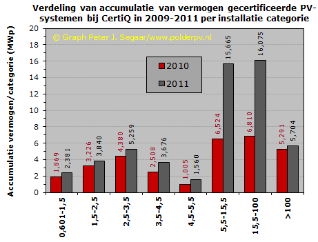 Als ik echter mijn projectenlijst er op navlooi, kom ik voor de grootste installaties die in Nederland eind 2011 zouden zijn gerealiseerd al op 23 systemen groter dan 100 MWp, met een gezamenlijk vermogen van 9 MWp. NB: daarbij hoort dus ook het 1,8 MWp Azewijn project van Pfixx Solar bij, wat pas medio 2011 definitief werd opgeleverd, maar niet het 850 kWp tellende Klepperstee project in Ouddorp, wat pas in 2012 definitief werd gerealiseerd. Dit is een forse discrepantie met het zeer lage vermogen wat voor de >100 kWp categorie bij CertiQ staat geregistreerd. Wellicht dat diverse van die projecten nog niet bekend zijn bij CertiQ. Of ze zouden daar niet eens geregistreerd staan, wat vrij onwaarschijnlijk lijkt. Het is verder ook beslist mogelijk dat ik het nodige aan projecten zal missen in die lijst (dit is een zeer lastige klus om bij te houden). Wie grote projecten (vanaf 15 kWp) aan me wil melden met zoveel mogelijk systeem gegevens, gaarne naar mijn mail adres!