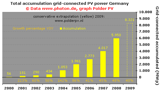 Het was natuurlijk geen "wereldrecord bijplaatsing" in Duitsland in 2008, want dat werd tijdelijk datzelfde jaar door Spanje gebroken met 2,5 of mogelijk 2,7 of zelfs meer GWp. Dat was echter een grote waanzinnige bouwboom door een combinatie van veel te lucratieve incentives, die door het Industrie Ministerium hardhandig is afgestraft met een keiharde marktcap van slechts 500 MWp voor het hele land voor 2009. Polder PV beschouwt die marktexplosie niet als representatief voor een "gezonde" marktontwikkeling. En: Duitsland blijft wereldkampioen geaccumuleerd vermogen. Je moet als natie van hele goede huize komen om dat record te kunnen breken. De enigen die daartoe in staat zouden kunnen zijn (als je alle waanzinnige plannen mag geloven) is het van PV-module productie uit zijn voegen barstende China. Want die slaat voor het gemak het "MWp" stadium maar over, en denkt al aan GigaWattpiek projecten (uit dezelfde Photon een artikel op pagina 34-39: meer dan 12,5 GWp aan plannen). Maar: first see, than believe. Harde realisatie, dat is wat we willen ...