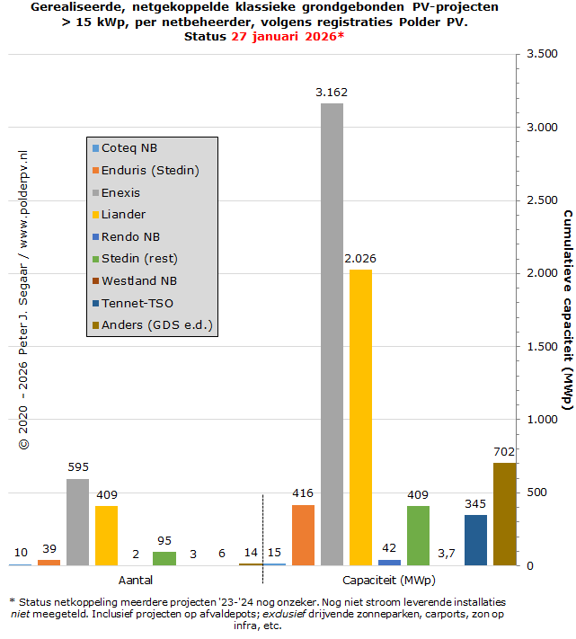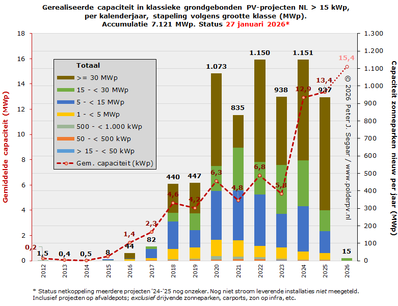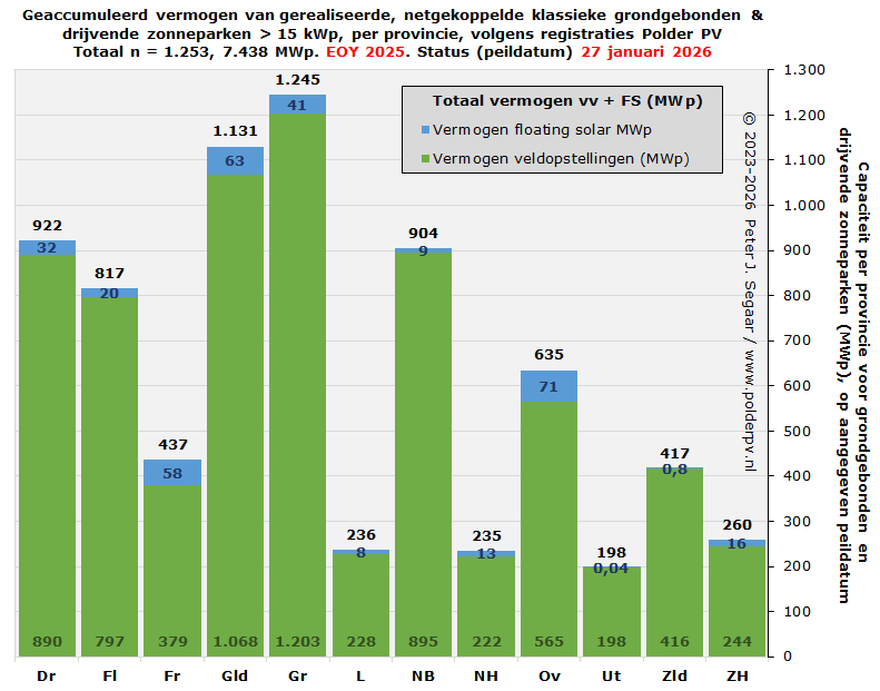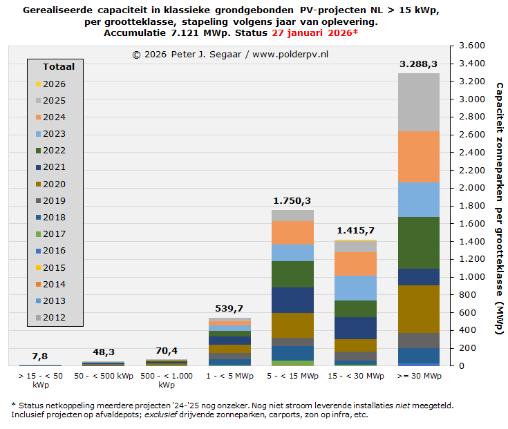 Als het tempo van de netgekoppelde oplevering aanhoudt, zoals in vooraande jaren, zullen we beslist een 7,5 GWp piketpaal kunnen verwachten in 2026, in de "Big Solarpark Sheet" van Polder PV. Of ook de 8,0 GWp gehaald zal worden, is momenteel nog twijfelachtig, gezien de voortdurende netproblemen die nog wel even zullen voorduren. Er staat sowieso nog ruim 3,4 GWp aan resterende SDE ("+" en "++" tm. SDE 2024) beschikkingen voor uitsluitend de categorie grondgebonden zonneparken klaar, en daar gaat nog een deel van de eind 2025 door MinKGG geopenbaarde 1.075 MWp aangevraagd voor deze categorie onder SDE 2025 bijkomen (minus vermoedelijk, gezien de enorme overtekening, flinke hoeveelheid afvallers). Ook is er nog een beperkt volume beschikt voor drijvende zonneparken, 215 MWp, maar die worden apart behandeld, in paragraaf 11.